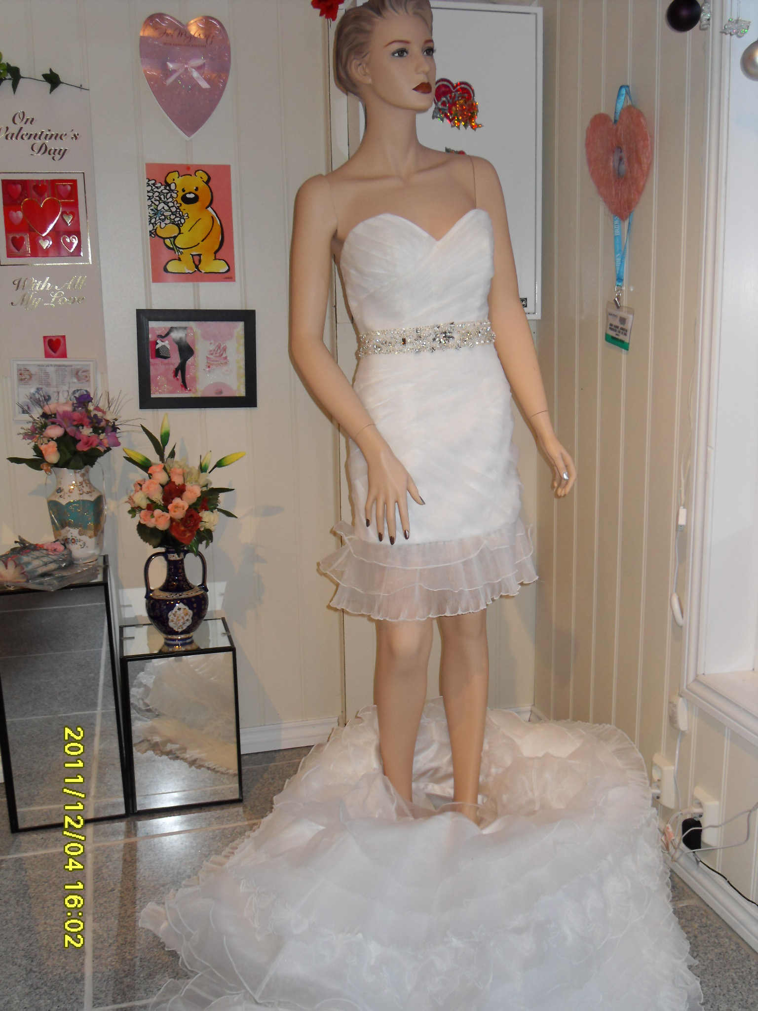 Først er brudekjolen lang, og ved et napp kan skjørtet tas av ved knærne (borrelås).