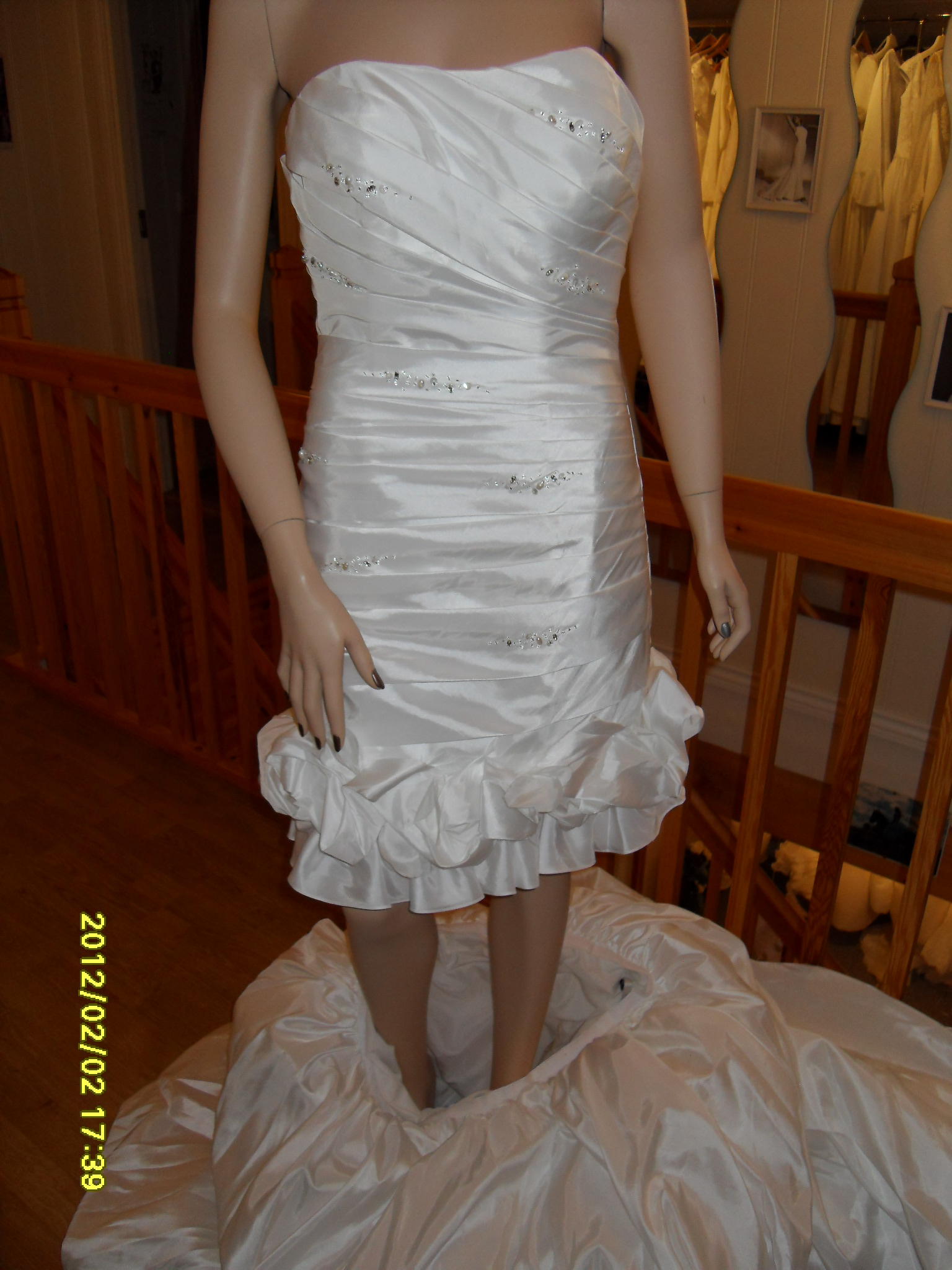 Her er brudekjolen fra brudekjoleprodusenten Eternity Bride som kan gjøres om fra lang til kort brudekjole! Brudekjolen er i rysjer i chiffon, og over kneet er det en solid borrelås, skjult under rysjene, og ved et røsk kan brudekjolen gjøres knekort, smart ikke sant? Så her får man i praksis 2 brudekjoler til prisen av 1. Praktisk med en kort brudekjole til senere på kvelden når det skal danses, eller hvis man har tenkt til å gifte seg i en storby eller på en strand.....