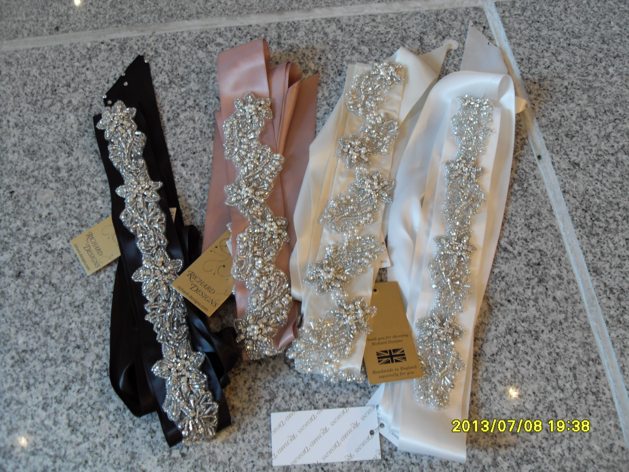 Vi har nå fått i flere flotte brudekjoler belter, og disse kan skaffes i flere farger, som kan bestilles fra Richard Designs i England, håndlagde i ypperste kvalitet. Fargene som vist her er i sort, antikk rosa, ivory og antikk hvit i sateng, blanke stener og perler. Kom og se og prøv og brudekjolen får et helt spesielt og unikt preg!