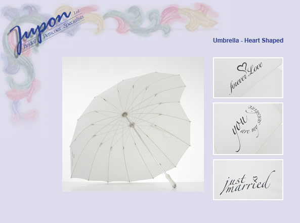 Vi tar nå disse dårlige norske somrene på alvor og har kjøpt inn flotte doble brudeparaplyer fra Jupon i fargen ivory i hjertefasong og plass til både brud og brudgom under med teksten påtrykt: "Just married". Så kan man jo også være stilig og elegant selv om regnet skulle hølje ned på den store dagen, blir ikke våt og samtidig vil denne elegante paraplyen passe til brudeantrekket og skape oppmerksomhet.