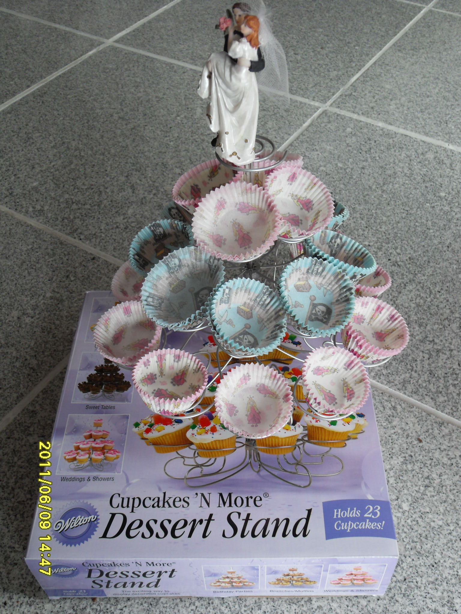 Stilig cupcakestativ med plass til 23 stk. cupcakes. Brudepar er montert på toppen og med medfølgende fine, forskjellige og fargerike kakeformer. Hvis man trenger plass til flere former, så kan hele stativet settes på et fint kakefat, også danderer man de andre kakene på fatet. Lag forskjellige kaker, med forskjellig fyll, krem og dekor. Kjøp så former i forskjellige mønstre og farger. Her er det bare fantasien som setter grenser. Dette blir garantert en suksess i et bryllup! I utlandet har dette vært populært i flere år, og mange bruker også cupcakes som bryllupskake. Her kan man jo ha mange forskjellige smaker, og denne spesielle bryllupskaken vil jo smake alle! Man kan bruke oppskriften på cupcakes, også ha diverse fyll i som feks. jordbær, skogsbær, bringebær, sjokolade osv. Det er også fullt mulig å bruke gode og vanlige kakeoppskrifter av favorittkakene dine, for så å fylle disse i formene, men da med naturligvis mye kortere steketid, ca. 15 minutter vil nok være tilstrekkelig da.